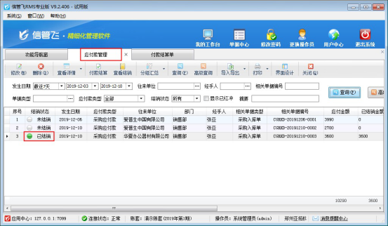 付款結(jié)算單可登記付款信息(付款對象即供應商、付款賬戶、付款金額、經(jīng)手人等),并結(jié)銷應付款記錄。本篇文章以信管飛RMS軟件為例演示一下對應付款進行付款結(jié)算的操作步驟。 信管飛RMS軟件的應付款記錄是根據(jù)開的采購入庫單保存審核后自動生成的,是一一對應的。在功能導航窗點擊“往來管理”—》“應付款管理”可查看單據(jù)生成的應付款記錄,選擇一條未結(jié)銷的應付款,點擊工具欄的“付款結(jié)算”,進行付款結(jié)算操作,如下圖所示: 點擊“付款結(jié)算”按鈕,可以打開付款結(jié)算單界面。