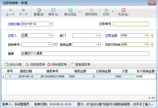 付款結算單可登記付款信息(付款對象即供應商、付款賬戶、付款金額、經手人等),并結銷應付款記錄。本篇文章以出納記賬軟件為例演示一下對應付款進行付款結算的操作步驟。 在功能導航窗點擊“往來管理”—》“應付款管理”打開應付款管理界面新增一條應付款記錄,如下圖所示,供應商“文具超市”應付金額為2000元,已結銷金額為0。 在應付款管理界面點擊“付款結算”按鈕可以打開付款結算單對應付款進行付款結算,如下圖所示,在付款結算單單據主體選擇付款賬戶后錄入“付款金額”2000元,單據明細中“本次結銷金額