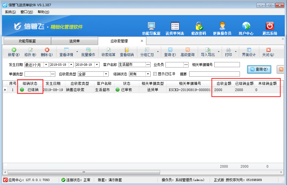收款結算單用來登記收款信息(收款對象即客戶、收款賬戶、收款金額、經手人等),并結銷應收款記錄。本篇文章以送貨單打印軟件為例演示一下對應收款進行收款結算的操作步驟。 在功能導航窗點擊“往來管理”—》“應收款管理”可以打開應收款管理界面,應收款管理是對包括銷售應收款、期初應收款、其他應收款等各類應收款項的集中管理。應收款記錄一般由送貨單自動生成,其類型為“銷售應收款”,或者由退貨單自動生成,其類型為“銷售退貨應退款”。在應收款管理中可以查看應收款記錄對應的業務單據以及應收款詳細結銷情況。如下圖所示,客戶“生活超市”應收金額為