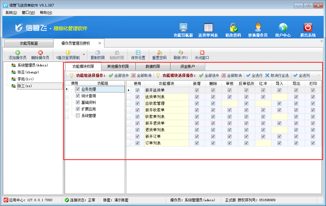 進銷存管理軟件、倉庫管理軟件、出納記賬軟件、送貨單軟件等都支持設置多個操作員登錄軟件,本文以送貨單軟件為例演示一下如何新增操作員賬號并設置操作員權限? 操作員及授權實現對操作員的管理和權限分配。權限分為功能模塊權限、其他操作權限、數據權限等。另外部分權限(如資金賬戶權限)需要在“系統參數配置”中啟用相應的參數,才可以使用。 在功能導航窗點擊“系統管理”—》“操作員及授權”即可進入到操作員管理及授權界面,如下圖所示。 添加操作員:可以將“員工信息”中的