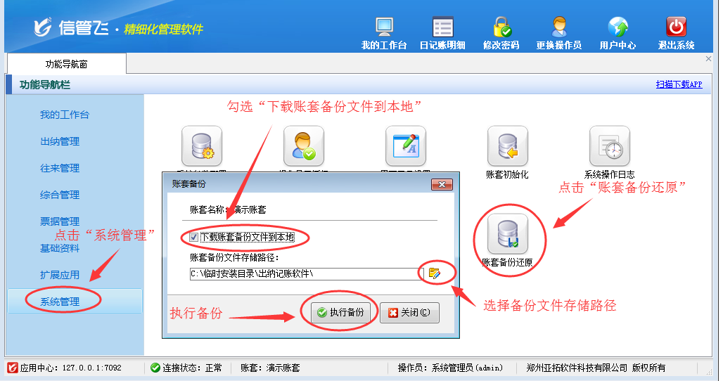 信管飛出納記賬軟件、信管飛送貨單軟件、信管飛RMS等軟件賬套數據默認存儲在軟件安裝目錄下,支持對賬套數據進行備份,如需要更換主機電腦,需要在原來的主機電腦上備份賬套數據,將生成的備份文件復制到新的主機電腦上,然后在新的主機電腦上安裝軟件,使用備份文件還原數據即可。 以信管飛出納記賬軟件為例,演示一下更換電腦時如何在原來的主機電腦上備份賬套數據? 一、在信管飛出納記賬軟件應用中心程序中執行賬套備份。 請在應用中心程序中,點擊“賬套管理”進入賬套管理界面