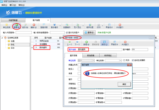 信管飛送貨單軟件支持新增客戶信息,為了避免增加的客戶信息出現(xiàn)重復(fù),軟件支持設(shè)置參數(shù)不允許客戶名稱(chēng)重復(fù)。 登錄軟件,在“系統(tǒng)管理”—》“系統(tǒng)參數(shù)配置”—》“業(yè)務(wù)參數(shù)”中的“數(shù)據(jù)可否重復(fù)參數(shù)”把“往來(lái)單位名稱(chēng)可重復(fù)”的勾選符號(hào)取消,然后保存設(shè)置。如下圖所示:圖1 設(shè)置完成后,打開(kāi)功能導(dǎo)航窗的“基礎(chǔ)資料”—》“客戶信息”。新增一個(gè)客戶,輸入和之前已有客戶一樣的名稱(chēng),保存會(huì)提示“當(dāng)前輸入的單位名稱(chēng)已存在,請(qǐng)檢查后重試!”,如下圖所示:圖2 歡迎下載試用可設(shè)置
