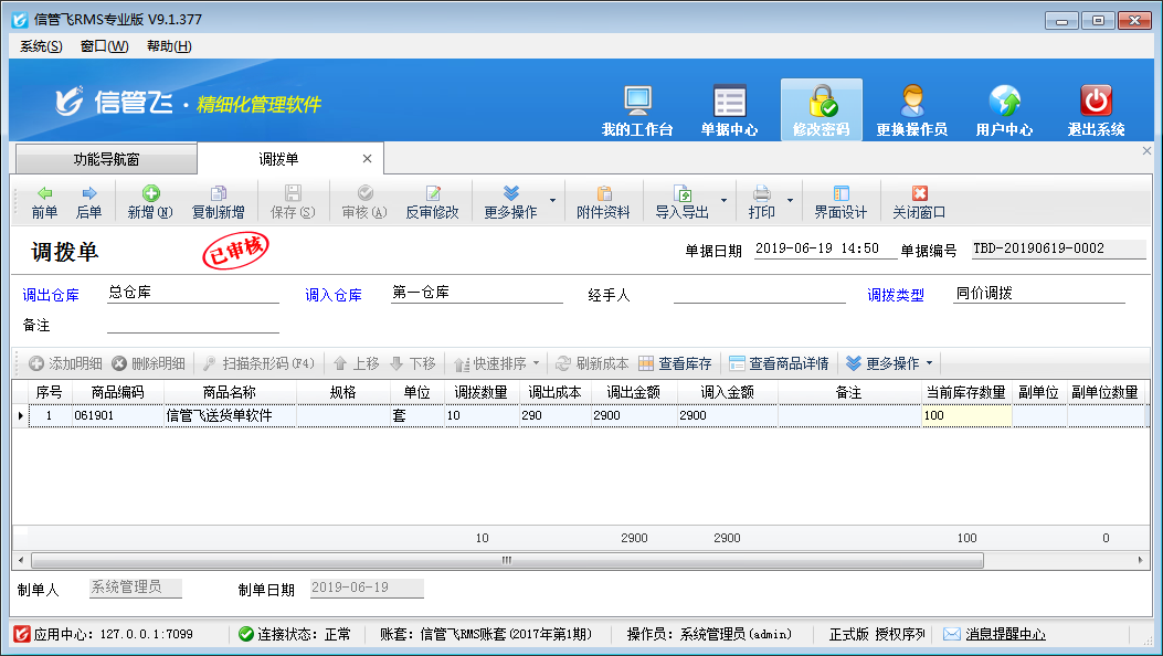 信管飛RMS及信管飛倉(cāng)庫(kù)管理軟件都支持調(diào)撥單,調(diào)撥單主要用于庫(kù)存商品在各倉(cāng)庫(kù)之間的調(diào)貨。調(diào)撥分為同價(jià)調(diào)撥和變價(jià)調(diào)撥兩種,其中同價(jià)調(diào)撥方式,商品的成本價(jià)以調(diào)出倉(cāng)庫(kù)的成本價(jià)為準(zhǔn);變價(jià)調(diào)撥(或稱(chēng)“異價(jià)調(diào)撥”),商品的成本價(jià)可進(jìn)行修改,一般用于分?jǐn)傔\(yùn)費(fèi)/裝卸費(fèi)等運(yùn)輸費(fèi)用。總部到門(mén)店的調(diào)撥一般采用變價(jià)調(diào)撥。 在功能導(dǎo)航窗點(diǎn)“倉(cāng)庫(kù)管理”—》“調(diào)撥單”,即可進(jìn)入商品調(diào)撥單操作界面,如下圖所示: 同價(jià)調(diào)撥:同價(jià)調(diào)撥單即商品移庫(kù),是將商品從一個(gè)倉(cāng)庫(kù)轉(zhuǎn)移到另一個(gè)倉(cāng)庫(kù)的過(guò)程。同價(jià)調(diào)撥單不產(chǎn)生調(diào)撥費(fèi)用,或調(diào)撥