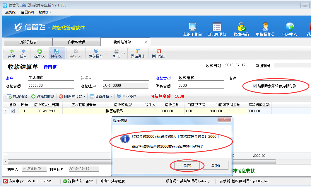 演示視頻觀看鏈接:收款結(jié)算時(shí)如收款金額大于結(jié)銷(xiāo)金額如何處理演示視頻 收款結(jié)算單用來(lái)登記收款信息(收款對(duì)象即客戶、收款賬戶、收款金額、經(jīng)手人等),并結(jié)銷(xiāo)應(yīng)收款記錄。正常情況下,應(yīng)收金額為多少,即客戶支付我們多少貨款,但是部分情況下客戶支付給我們貨款時(shí)會(huì)多支付一些作為預(yù)付款,這種情況下該如何開(kāi)收款結(jié)算單,本篇文章我們以信管飛出納記賬軟件為例演示一下操作步驟。 如下圖所示,客戶“生活超市”應(yīng)收金額為2000元,已結(jié)銷(xiāo)金額為0。在給我們支付貨款時(shí),支付了3000元,多余的1000元
