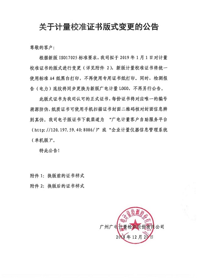 根據新版ISO17025標準要求,我司擬于2019年1月1日對計量校準證書的版式進行變更(詳見附件2),新版計量校準證書將統一使用標準A4紙黑白打印,不再使用專用證書紙打印。同時,檢測報告(電力)底紋將同步更換為新版廣電計量LOGO,不再另行公告。