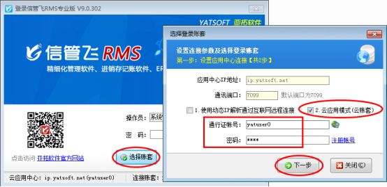 下面我們以信管飛RMS專業(yè)版為例,示范下如何使用云應(yīng)用模式(云賬套)。示例通行證賬號(hào):yatuser0,支持新建最多3個(gè)賬套,支持最大連接數(shù)是2個(gè)。
