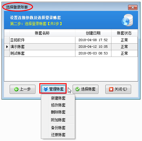 在“選擇登錄賬套”界面可以管理賬套,管理賬套支持新增賬套、修改賬套、刪除賬套、附加賬套、備份賬套、還原賬套操作。如下圖所示: