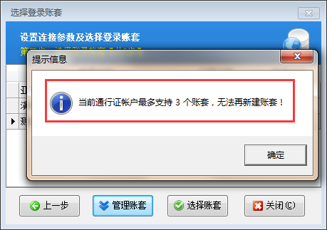 新建帳套時(shí)如果出現(xiàn)如下提示,說(shuō)明帳套數(shù)量已經(jīng)超過所購(gòu)買的云帳套數(shù)量。如果需要增加更多的帳套,可聯(lián)系我們客服。