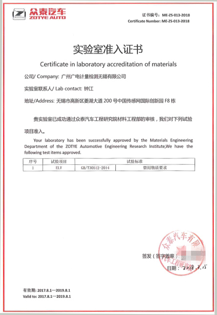 無錫子公司獲沃爾沃、眾泰汽車第三方實驗室能力認可