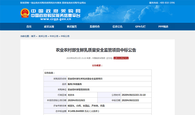 2020年6月,沈陽廣電計量中標農業農村部生鮮乳質量安全監管項目,將配合農業農村部實施生鮮乳質量安全監測計劃,協助政府全面掌握生鮮乳質量狀況,加強乳品質量安全工作。這是繼2019年承接農業農村部生鮮乳質量安全監管項目后,沈陽廣電計量再次中標該項目。