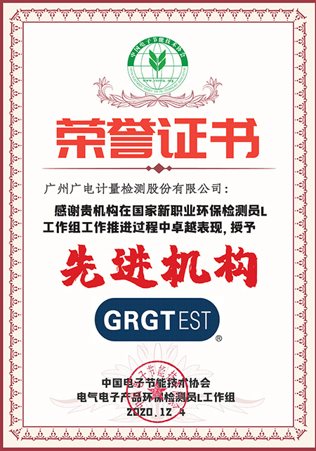 廣州廣電計量檢測股份有限公司(簡稱廣電計量)作為中國 RoHS 標準工作組技術成員單位及中國電子節能技術協會電器電子綠色制造專委會副主任委員單位,出席此次培訓班及國家新職業工作組推進實施工作會議,獲頒“電氣電子產品環保檢測員 L”工作組“先進機構”榮譽稱號。