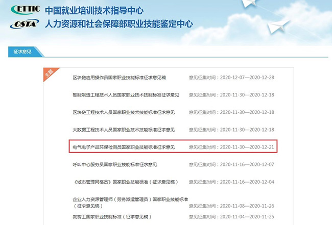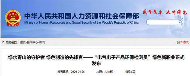 2020年 2月 25日,人社部,國家統計局,市場監督管理總局聯合向社會發布了 16 個新職業。其中,“電氣電子產品環保檢測員”作為“綠色職業”被正式納入國家職業分類目錄。