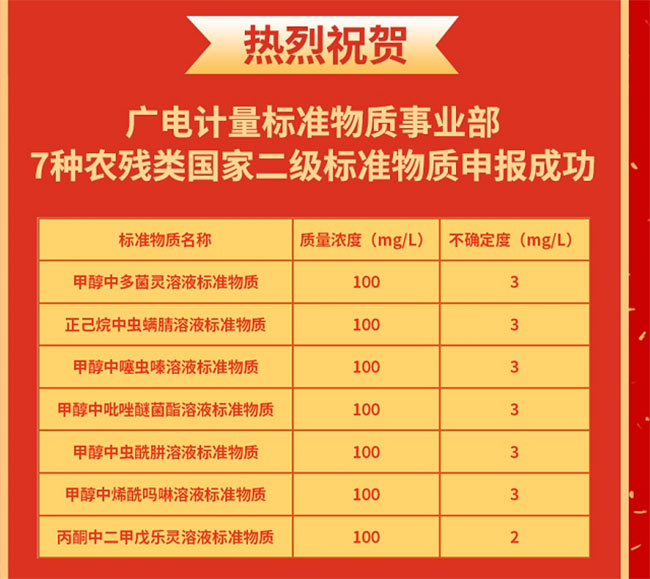 9月7日,廣州廣電計(jì)量檢測(cè)股份有限公司(簡(jiǎn)稱:廣電計(jì)量)與中國(guó)農(nóng)業(yè)科學(xué)院農(nóng)業(yè)質(zhì)量標(biāo)準(zhǔn)與檢測(cè)技術(shù)研究所(簡(jiǎn)稱:中國(guó)農(nóng)科院質(zhì)標(biāo)所)聯(lián)合研制的甲醇中多菌靈溶液標(biāo)準(zhǔn)物質(zhì)等7種農(nóng)藥類標(biāo)準(zhǔn)物質(zhì),順利通過(guò)了全國(guó)標(biāo)準(zhǔn)物質(zhì)管理委員會(huì)的專家評(píng)審,成為廣電計(jì)量首批研發(fā)的國(guó)家有證標(biāo)準(zhǔn)物質(zhì)。