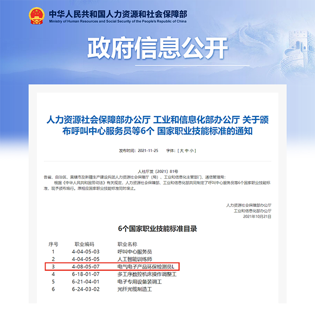 2020年2月25日,人社部、國家統計局、市場監督管理總局聯合向社會發布了16個新職業。其中,“電氣電子產品環保檢測員”作為“綠色職業”被正式納入國家職業分類目錄。這是自2019年國家新職業發布以來的第二批國家新職業,其中電氣電子產品環保檢測員L名列其中,是環保類的唯一新職業,也是工信部送審的5個新職業中唯一被專家評審通過的新職業,是對電氣電子產品環保從業人員的認可。