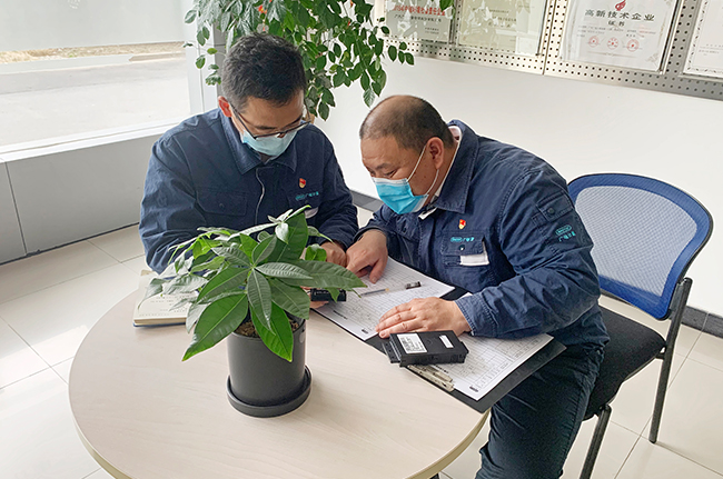 上海子公司黨支部書記、可靠性與環境試驗實驗室副主任龐威(左)與瞿軍討論疫情防護工作