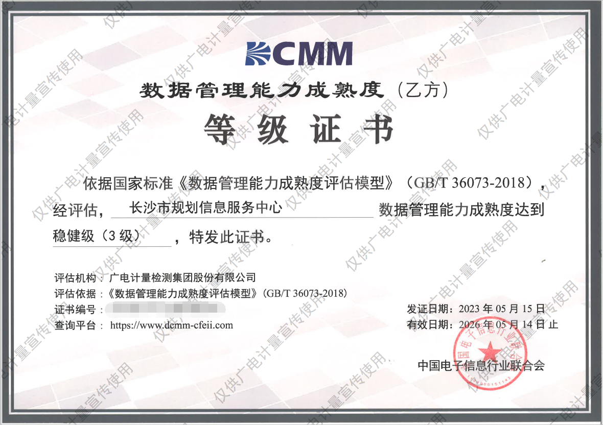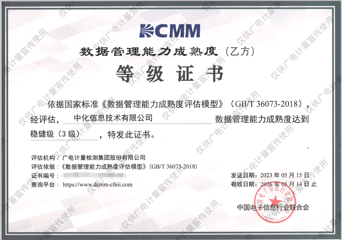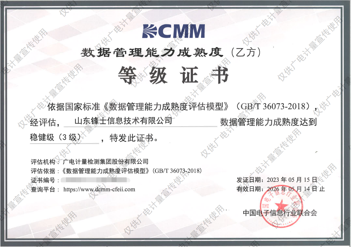 2023年4月,中國電子信息行業聯合會召開本年度“首次DCMM標準貫標評估報告專家評審會”,廣電計量評估的中化信息技術有限公司、廣東省電信規劃設計院有限公司、長沙市規劃信息服務中心、山東鋒士信息技術有限公司、中數通信息有限公司等優秀企業順利通過DCMM 3級(穩健級)的評審,至此,廣電計量累計服務的3級以上貫標企業已達20余家。