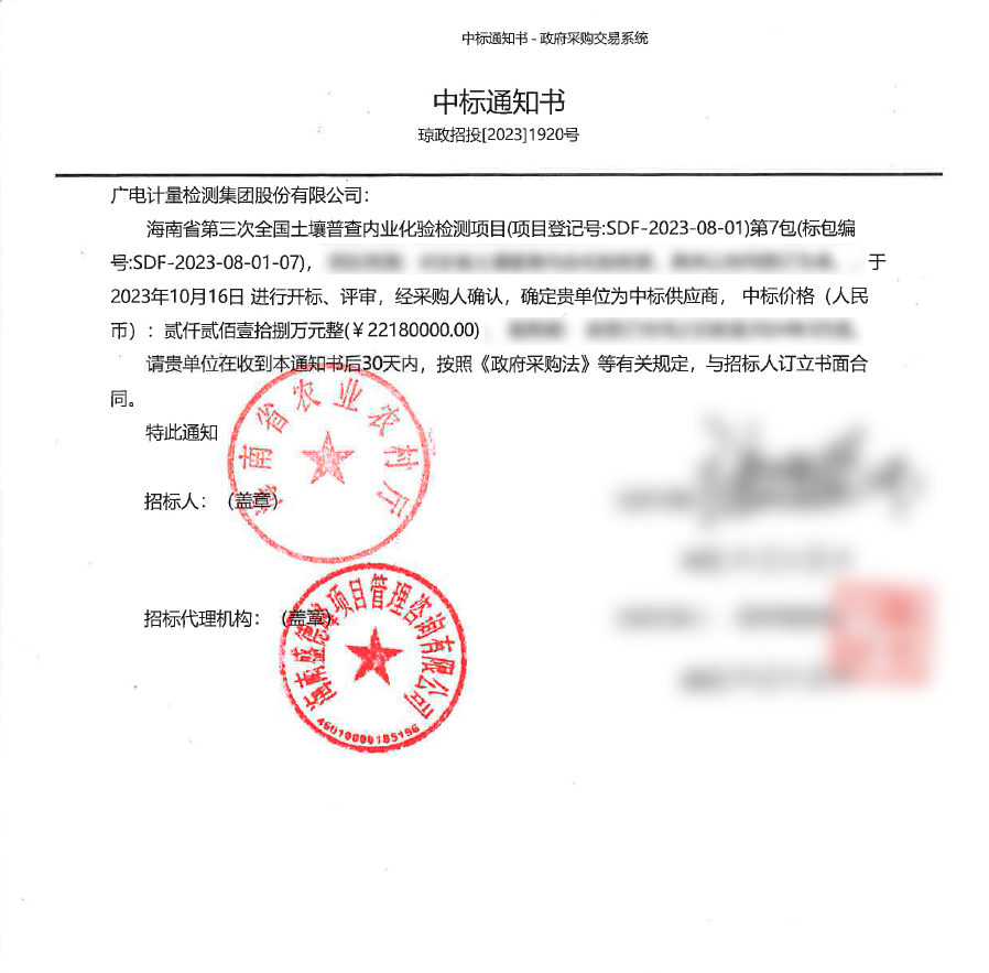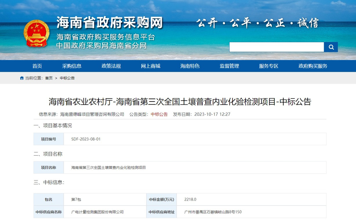 近日,廣電計(jì)量中標(biāo)海南省農(nóng)業(yè)農(nóng)村廳-海南省第三次全國(guó)土壤普查內(nèi)業(yè)化驗(yàn)檢測(cè)項(xiàng)目第7包,項(xiàng)目金額2218萬元,體現(xiàn)了主管部門對(duì)公司技術(shù)能力、質(zhì)量管理與服務(wù)水平的認(rèn)可。