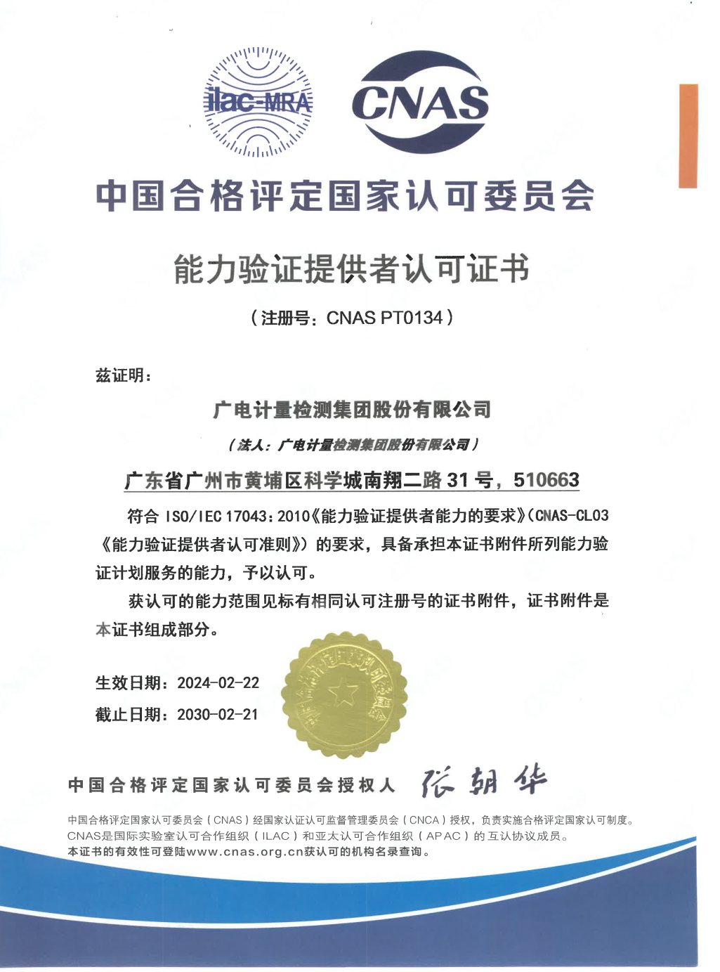 近日,廣電計量獲得由中國合格評定國家認可委員會(CNAS)頒發的能力驗證提供者(PTP)認可證書(注冊編號:CNAS PT0134),正式成為具有CNAS PTP認可資質的能力驗證提供者。
