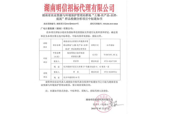 7月27日,GRGT湖南子公司,即廣電計量檢測(湖南)有限公司收到湖南明信招標代理有限公司發(fā)來的《中標通知書》,GRGT湖南子公司被確認為湖南省農(nóng)業(yè)廳農(nóng)業(yè)資源與環(huán)境保護管理站耕地 “土壤-農(nóng)產(chǎn)品-水樣-底泥”樣品檢測分析項目(政府采購編號:湘財采計【2015】002619號)第五包中標單位,涉及樣品總量1.6萬個,總金額606.77萬元,中標合同順利簽訂后,GRGT將在長沙縣15個鄉(xiāng)鎮(zhèn)全面展開“土壤-農(nóng)產(chǎn)品-水樣-底泥”樣品檢測分析,為耕地土壤重金屬污染防治提供科學、準確、可靠的檢測數(shù)據(jù)和治理建議。