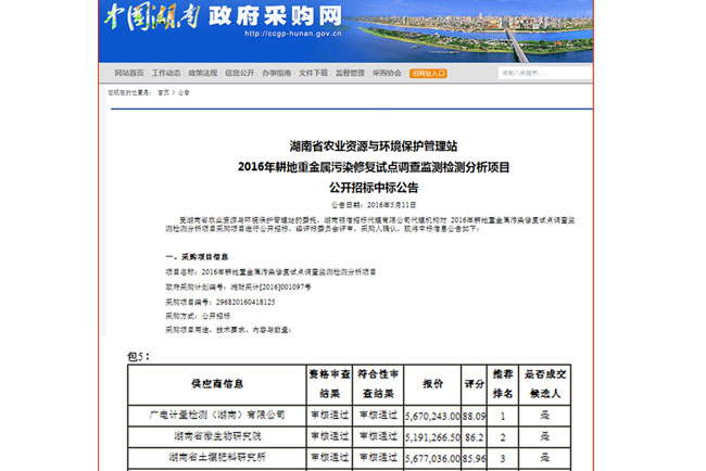 5月11日,湖南省政府采購網正式發布公告,廣電計量湖南子公司被確認為湖南省農業資源與環境保護管理站2016年耕地重金屬污染修復試點調查監測檢測分析項目中標單位,中標涉及樣品15927個。這是公司繼2014年中標長株潭耕地“土壤-農產品-水樣”檢測分析項目和2015年“土壤-農產品-水樣-底泥”樣品檢測分析項目后,再一次順利中標國家級項目,參與國家重金屬污染耕地修復綜合治理項目的工作。