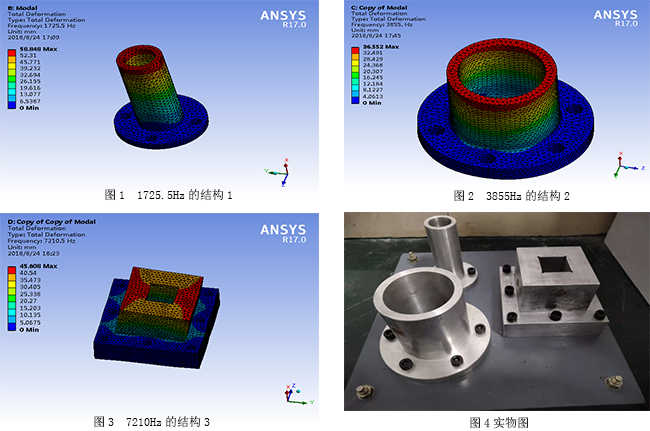 通過仔細分析帶電探傷儀工作原理可知,帶電探傷儀能通過激勵探頭和接收探頭共同作用,采用“一發一收”工作模式,獲取待測試結構的一階固有頻率,通過一階頻率值判斷絕緣子是否發生了損傷。廣電計量瓷支柱絕緣子帶電探傷儀性能檢測系統根據帶電探傷儀的工作頻率范圍(100Hz~10000Hz),設計了三種一階頻率在此范圍的特殊結構裝置——一端固定,一端自由的懸臂梁結構,并用有限元軟件進行仿真,結果如下圖所示。(圖1~ 3為有限元仿真的三種結構的一階固有頻率,圖4為制作的實物圖)