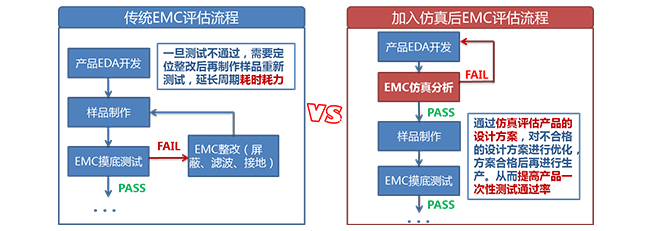 1) 對于傳統(tǒng)的產(chǎn)品開發(fā)流程,大多是在樣品設(shè)計(jì)及生產(chǎn)后,再依據(jù)相關(guān)測試標(biāo)準(zhǔn)對產(chǎn)品進(jìn)行摸底測試和評估。一旦出現(xiàn)EMC不符合時(shí),往往需要通過整改后再次制作樣品并重新測試。