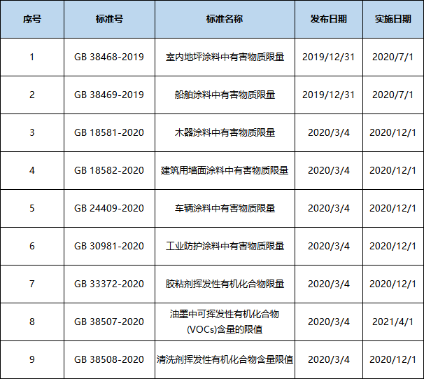 A:2020年3月7日,國標委公布由國家市場監督管理總局(國家標準化管理委員會)批準的《木器涂料中有害物質限量》等7項國家標準。2019年發布的GB 38468-2019《室內地坪涂料中有害物質限量》等2項國家標準,涉及四類分別是:涂料、膠粘劑、油墨以及清洗劑的標準。