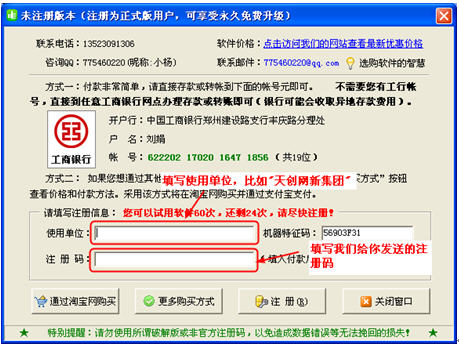 您在下載試用過我們的軟件后,如果覺得軟件符合自己的使用要求,有繼續使用的需求,這時候,就可以聯系我們購買付款,然后通過郵件或者QQ把“注冊窗口”中系統生成的機器特征碼發給我們,我們會根據您提供的機器特征碼,生成注冊碼。該注冊碼發給您,并進行注冊后,您使用的軟件就是注冊版的了,不再受使用時間和登錄次數的限制了。還可以享有該我公司提供的所有售后技術服務。