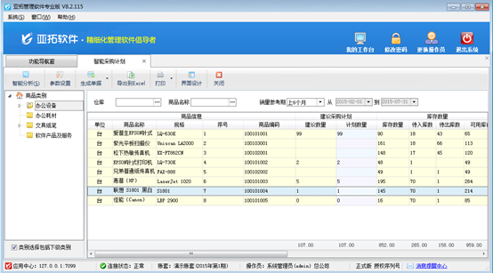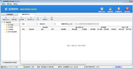 亞拓管理軟件支持由智能采購計劃生成采購計劃單。智能采購計劃功能可根據(jù)當前庫存情況,并可結合庫存上下限、同期銷售量、銷售訂單數(shù)量、待審核數(shù)量等條件進行組合運算,從而給出建議的商品采購量。可以把建議結果生成為采購訂單。智能采購計劃具體操作步驟如下: