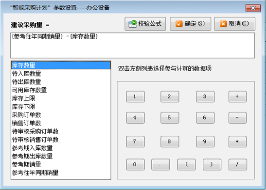 (1)參數(shù)設置:可以設置“建議采購量”的運算公式,軟件將根據(jù)您設計的公式計算出建議數(shù)量,如下圖2所示。