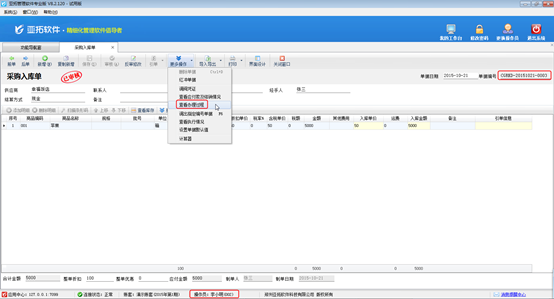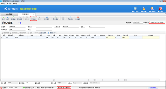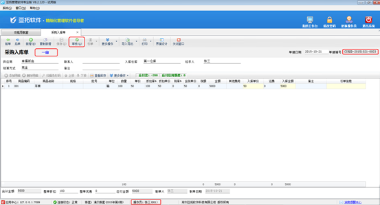 操作員“李小明”登錄亞拓管理軟件找到剛才的那個采購入庫單,單據狀態為“一審”。