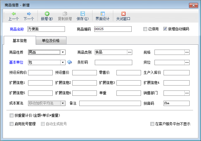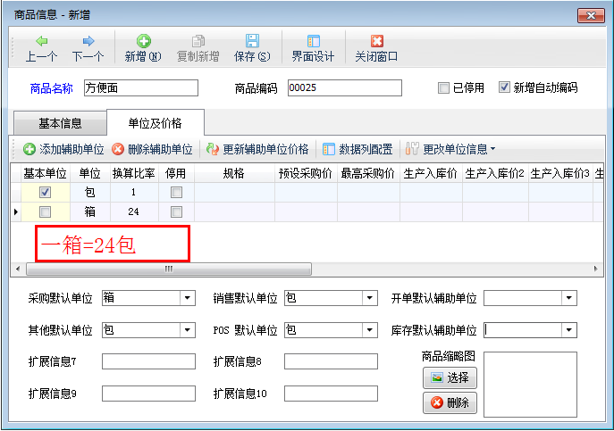 點擊“單位及價格”,進(jìn)入單位及價格界面,添加輔助單位,設(shè)置基本單位與輔助單位之間的換算關(guān)系,如商品“方便面”的基本單位“包”與輔助單位“箱”之間的換算關(guān)系為一箱等于24包,如下圖二所示。