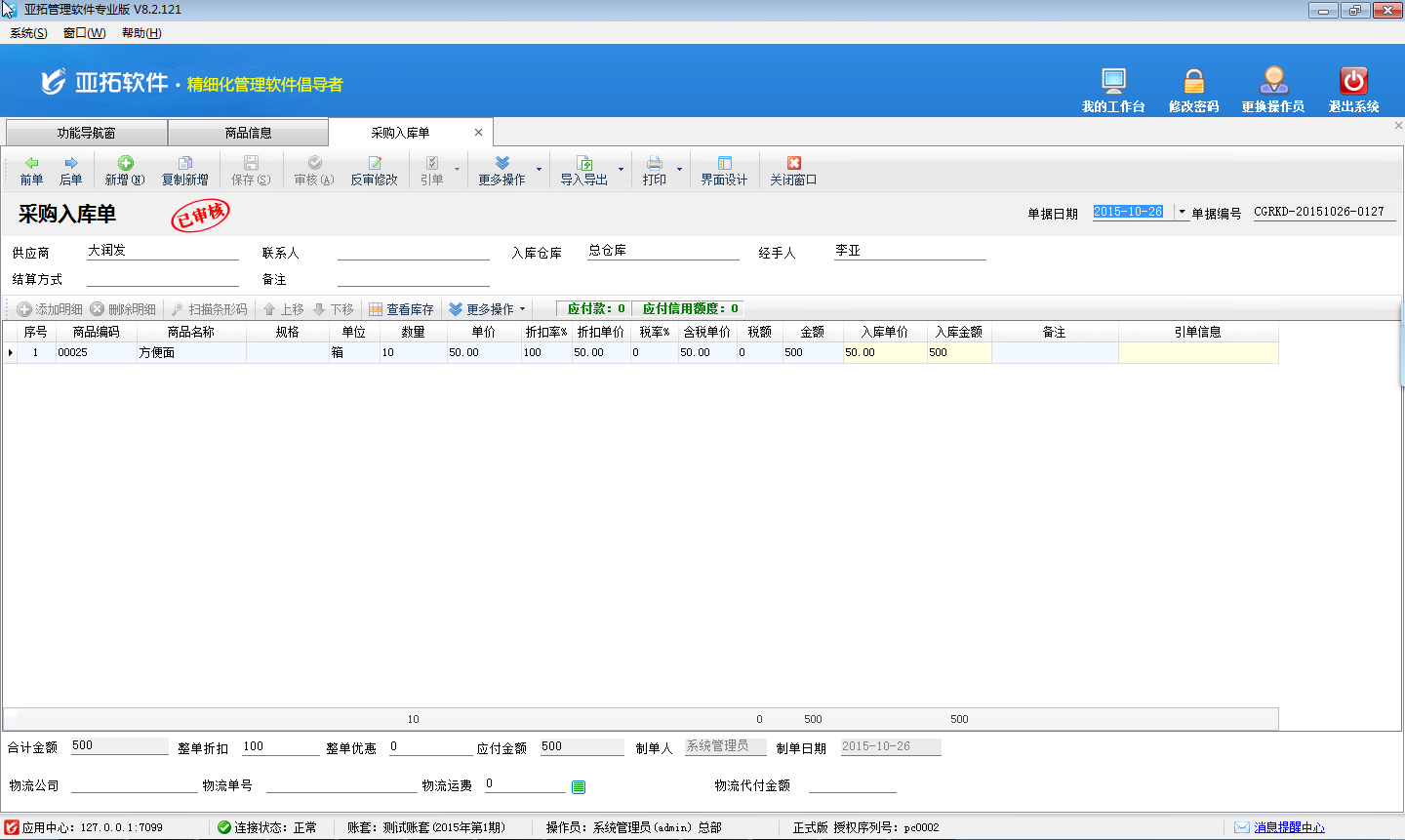 二、新開采購入庫單,采購商品“方便面”十箱,根據(jù)我們提前設(shè)置的換算關(guān)系可知:十箱等于240包,如下圖三所示。