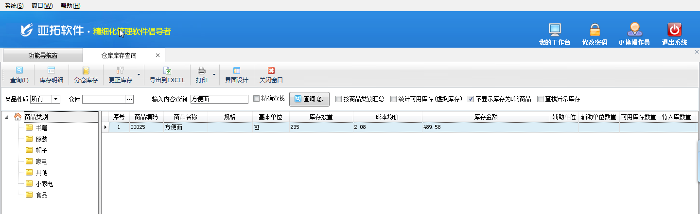 四、在功能導(dǎo)航窗點“倉庫管理”——》“相關(guān)統(tǒng)計查詢”——》“倉庫庫存查詢”,選擇商品“方便面”進(jìn)行查詢,可查到商品“方便面”此時的庫存為235包,如下圖五所示。