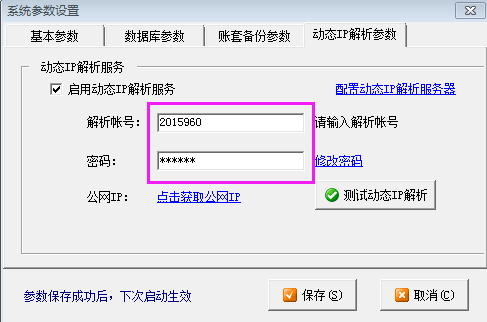 ②主機電腦配置動態IP解析服務參數,并定時將公網IP地址信息發送給亞拓軟件云服務器。