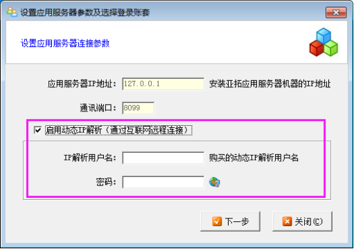 打開客戶端登錄界面的“選擇賬套”按鈕,然后勾選“啟用動態IP解析”,填寫IP解析用戶名和密碼,點擊“下一步”,進入選擇賬套的界面,選擇賬套后回到登錄界面,選擇操作員并輸入密碼,進入軟件首頁。