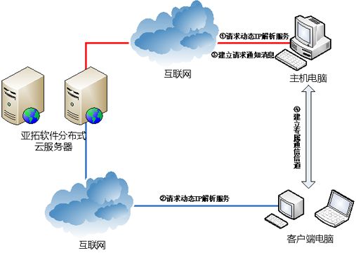 ①主機電腦向亞拓軟件云服務器發送動態IP解析服務請求。