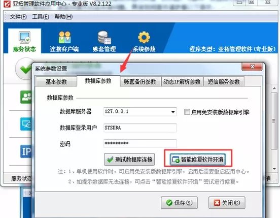 2、點擊“系統參數”,在“數據庫參數”頁點擊“智能修改軟件環境”。(也可點擊菜單“幫助----智能修復軟件環境”)
