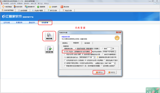 打開“系統(tǒng)管理”—“賬套參數(shù)”—“賬套參數(shù)”,將選項“錄入憑證時,啟用輔助科目(如手續(xù)費等)”打勾啟用輔助科目并保存,如下圖所示。