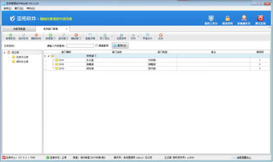 機構部門管理實現對使用單位的分支機構和部門的集中管理。“機構”即分支機構,是指總部(總公司)下的分支機構(如分公司、辦事處等),部門是總部或分支機構內部的組織。只有亞拓管理軟件專業版有“分支機構”擴展功能模塊,才可以維護分支機構。亞拓管理軟件(標準版、星光版)、紅管家倉庫管理軟件(專業版、標準版)只需要維護部門即可。下面我們以亞拓管理軟件專業版為例來演示一下具體的操作步驟。