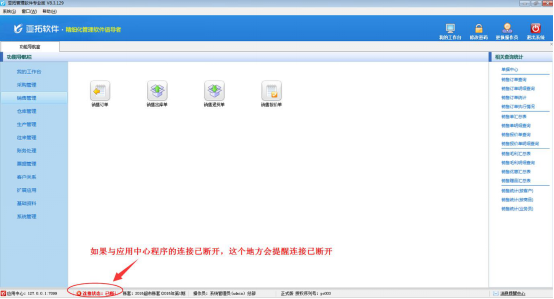 亞拓管理軟件、紅管家倉庫管理軟件、紅管家票據(jù)打印軟件都包括客戶端程序和應(yīng)用中心程序兩個(gè)模塊,客戶端程序登錄系統(tǒng)時(shí),應(yīng)用中心程序是必須打開的。如果主機(jī)電腦(網(wǎng)絡(luò)版用戶插入加密鎖的電腦為主機(jī)電腦)關(guān)機(jī)或關(guān)閉應(yīng)用中心程序、程序出現(xiàn)異常等,客戶端程序與應(yīng)用中心的連接就會(huì)斷開。應(yīng)用中心程序再次正常運(yùn)行后,客戶端程序需要重新建立與應(yīng)用中心程序的連接。下面我們以亞拓管理軟件專業(yè)版為例介紹一下客戶端程序重連應(yīng)用中心程序的操作。
