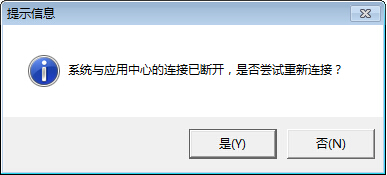 第一種解決方式:鼠標(biāo)雙擊軟件界面最下方的“連接狀態(tài):已斷開”字樣,系統(tǒng)會(huì)彈出“系統(tǒng)與應(yīng)用中心的連接已斷開,是否嘗試重新連接?”提示信息,如圖2所示,點(diǎn)“是”按鈕,客戶端程序會(huì)嘗試重新建立與應(yīng)用中心程序的連接。如果連接成功即可打開相應(yīng)的功能,繼續(xù)使用軟件。