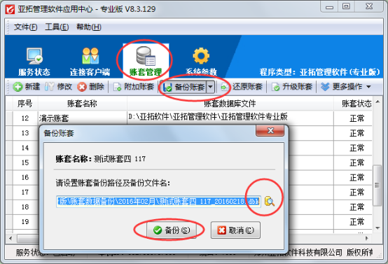 打開“亞拓管理軟件應用中心”,在應用中心主界面中點擊“賬套管理”進入賬套管理界面,選中我們需要備份的賬套,點擊“備份賬套”按鈕,可以彈出備份賬套的對話框,在此我們可以設置備份出來的賬套備份文件存放路徑實現對賬套的備份操作,如下圖所示。