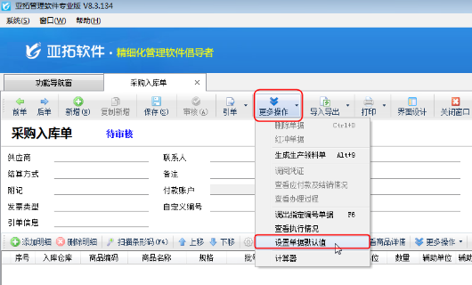 下面我們以亞拓管理軟件專業(yè)版采購入庫單為例詳細(xì)介紹下如何在亞拓管理軟件中設(shè)置單據(jù)默認(rèn)值。