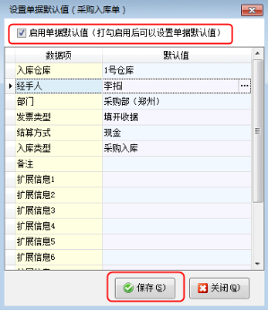 在“設(shè)置單據(jù)默認(rèn)值”窗口,勾選“啟用單據(jù)默認(rèn)值”,選擇需要設(shè)置的默認(rèn)值后點(diǎn)擊“保存”按鈕進(jìn)行保存。再次新增采購入庫單時(shí),單據(jù)主體上面會(huì)直接顯示設(shè)置好的數(shù)據(jù)項(xiàng)默認(rèn)值,如圖4所示。