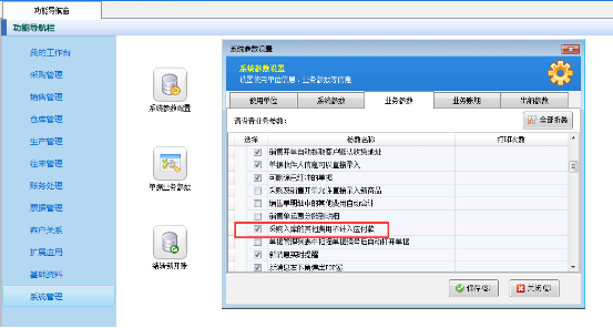 首先在功能導航窗點擊“系統管理”——》“系統參數配置”——》“業務參數”中打勾選擇“采購入庫的其他費用不計入應付款”啟用此參數(注意:只有亞拓管理軟件專業版及以上版本可以啟用此參數),設置好之后點擊“保存”按鈕即可保存設置,如下圖一所示。