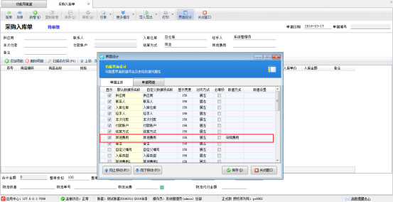 在功能導航窗點擊“采購管理”——》“采購入庫單”,打開采購入庫單界面,在界面設計中將“單據主體”及“單據明細”中“其他費用”字段配置顯示出來,“單據主體”中“其他費用”取值方式取“采購費用”,如下圖二所示。