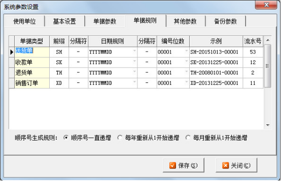 2、順序號生成規(guī)則設(shè)置:可配置各類單據(jù)按順序號一直遞增、每年重新從1開始遞增以及每月重新從1開始遞增,將各項數(shù)據(jù)配置好之后點擊保存即可。