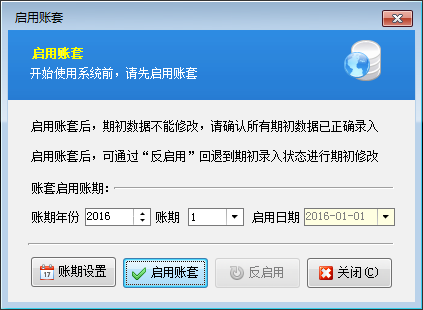啟用賬期:是指準備從哪個月份開始使用軟件(舉例:假設當前月份為2016年4月份,但我們想從2016年2月份開始使用軟件,可以將啟用賬期設置為2016年、賬期為2,這樣我們需要整理的期初數據就應該是截止到2016-02-01前的期初應收應付款、期初商品庫存,開賬后就可以錄入2016-02-01之后的業務單據)。