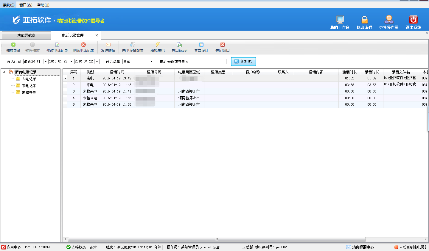 在電話記錄管理界面選擇通話時間,輸入來電號碼或者來電人信息查詢即可查詢到我們所需要的來電信息,選擇所需要的來電信息,點擊“播放錄音”按鈕即可播放當前來電的通話自動錄音。